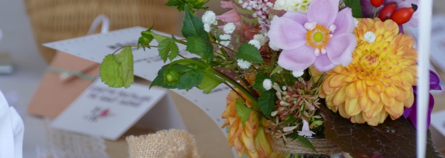 Le mois de septembre a été très clément avec (enfin ! ) quelques bonnes pluies et j’avais donc encore beaucoup de diversité au jardin, avec des dahlias au meilleur de leur forme. Caroline souhaitait des compositions colorées et des dahlias, cette fleur revêtant pour sa famille une signification particulière. J’ai donc confectionné 16 petits centres de table en associant les dahlias à des fleurs plus légères, à quelques feuillages et baies automnales.