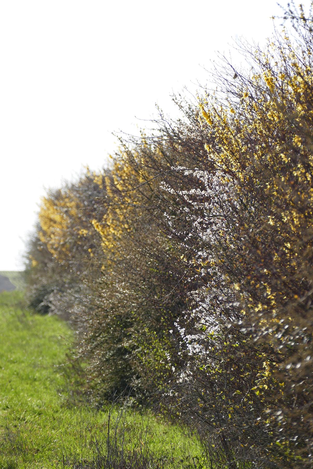Au tout début du printemps, les feuillages sont encore un peu timides. Nous cueillons notamment du sureau, de la viorne, du lierre, des branches de noisetier dont les feuilles émergent tout juste, puis du cornouiller et du troène. Une haie jouxtant l’une de nos parcelles d’orge nous offre d’abondantes récoltes, même par temps gris 😉