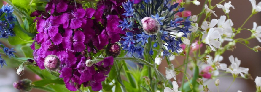 En ce moment, vous y trouverez du gypsophile, de l’allium azureum (un ail d’ornement bleu), des œillets de poète, des bleuets, des heuchères, de l’orlaya, de la cerinthe et des capsules de nigelle, pour une transition en douceur vers l’été. Une étiquette vous explique notre démarche et vous invite si vous le souhaitez à publier la photo du bouquet sur Instagram (@fermelesmessicoles et @collectif_delafleurfrancaise) ; par la même occasion, vous pourrez vous informer sur le collectif et le renouveau de la filière fleurs coupées en France.