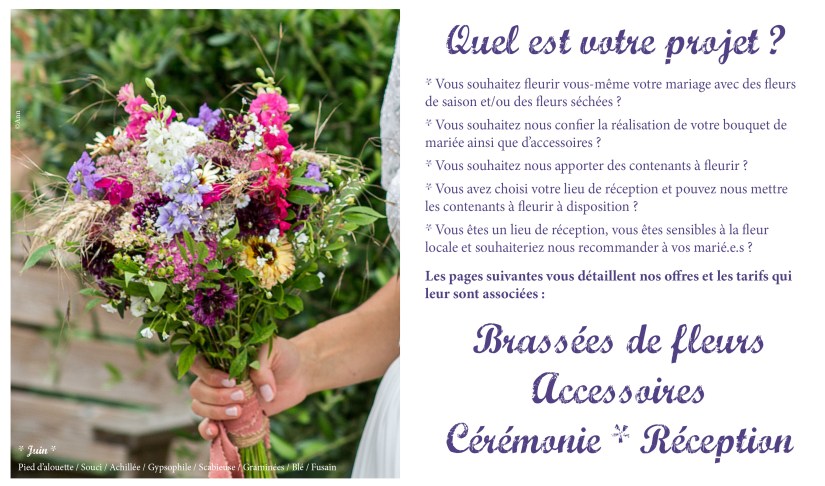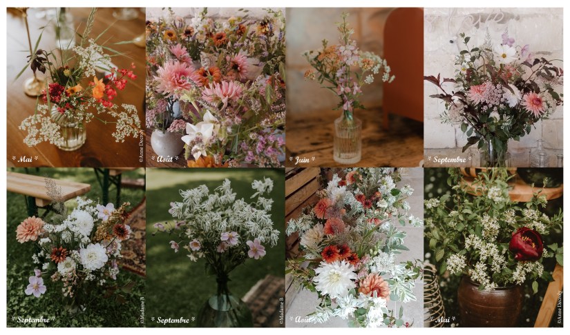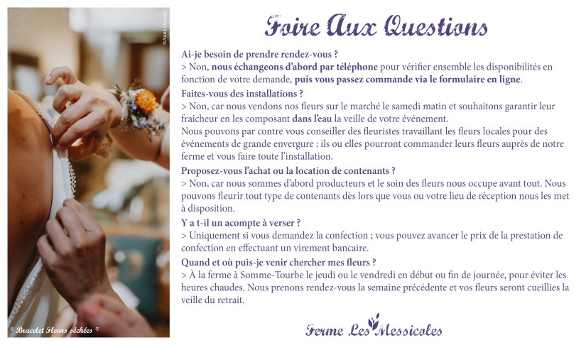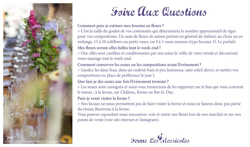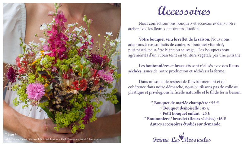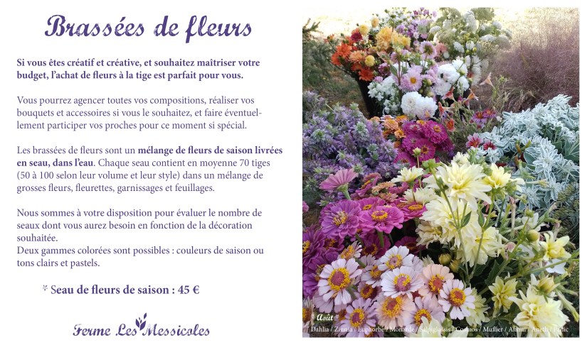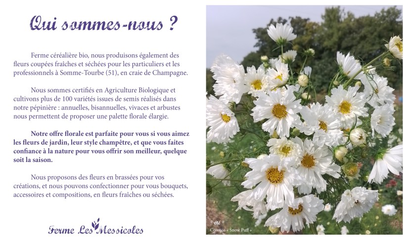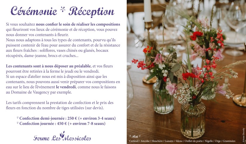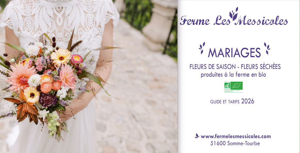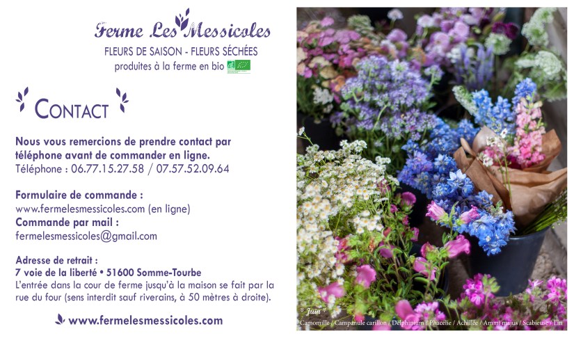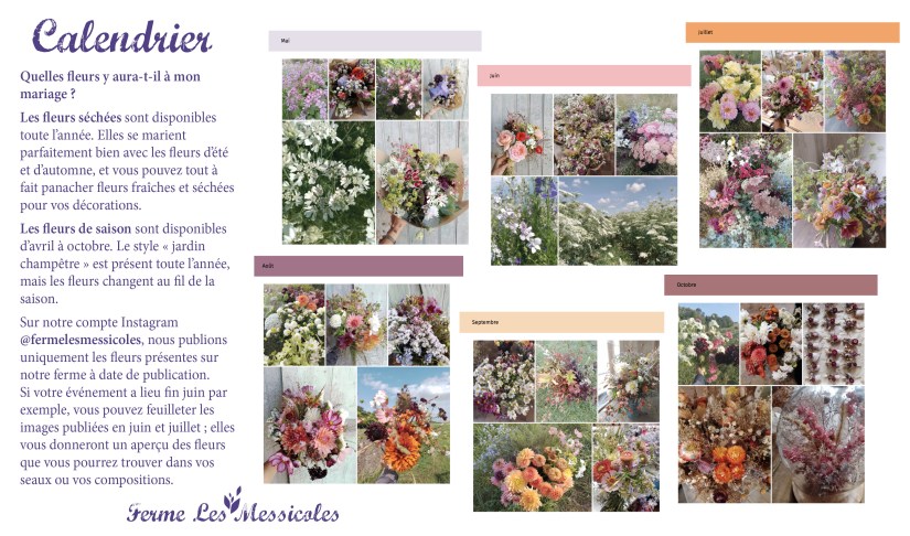 N’hésitez pas à consulter notre page Instagram @fermelesmessicoles pour prendre connaissance des fleurs que nous cultivons au fil des saisons et du style de compositions que nous produisons, champêtre et coloré.